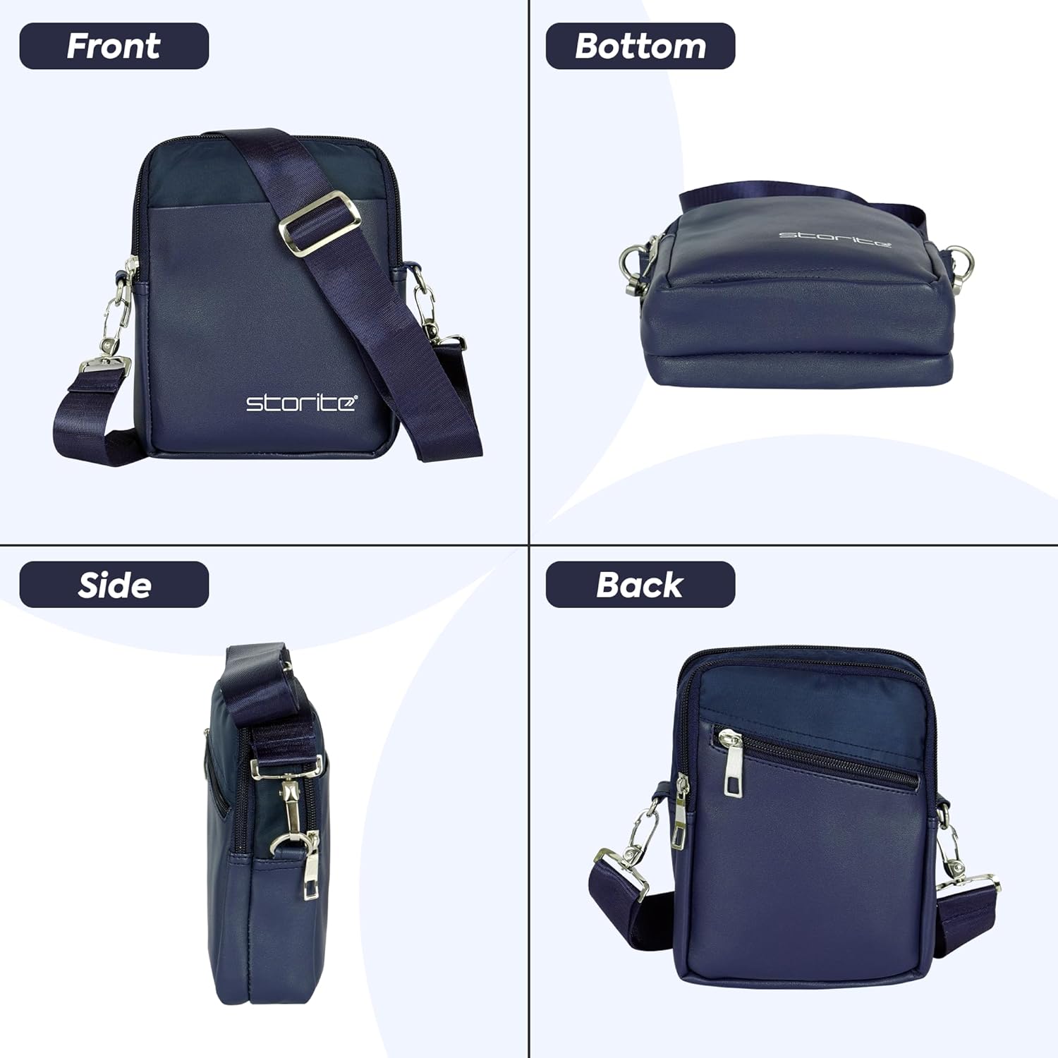 Crossbody bag structure: Total 4 pockets (2 main pockets, 1 back side zipper pocket, 1 front side open pocket without zipper), adjustable shoulder strap.