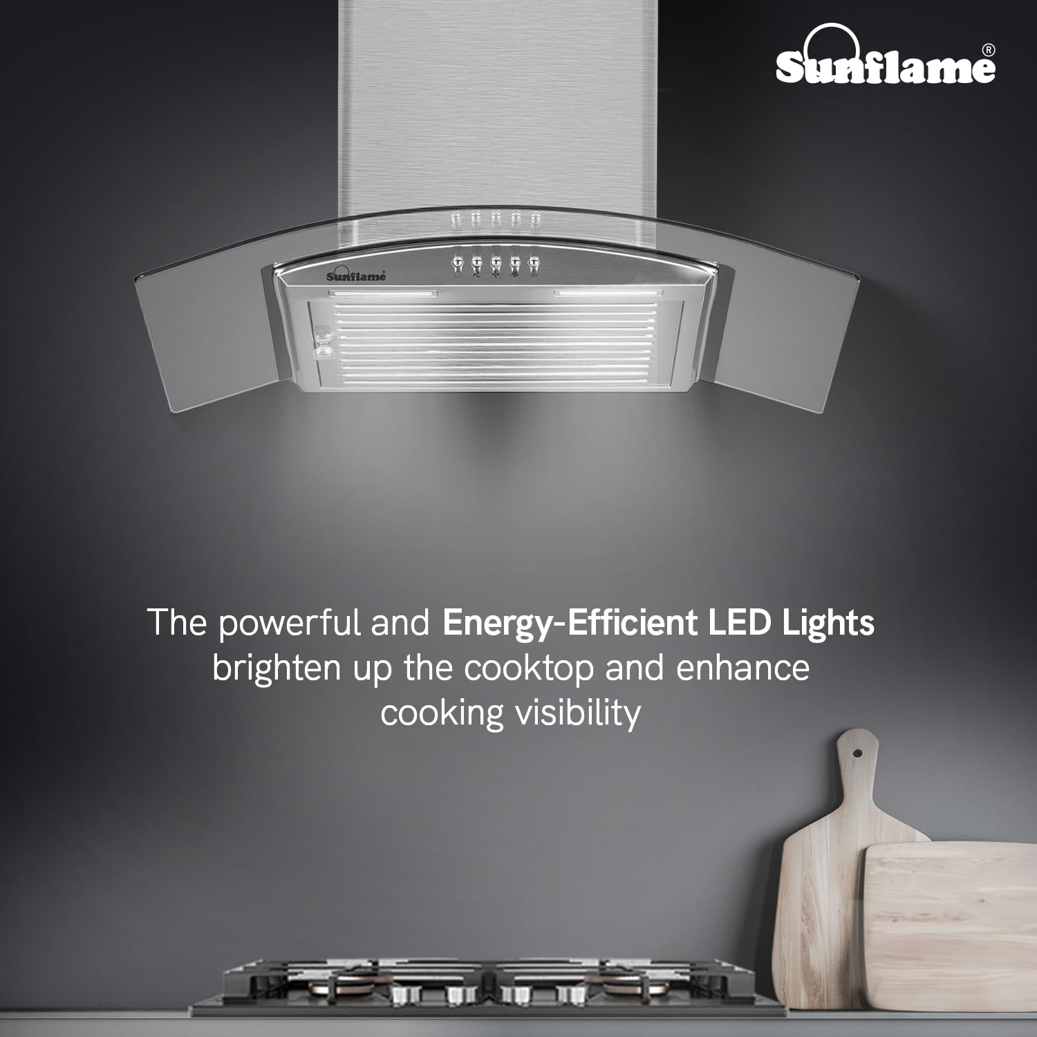 High-lumen LED light chimney: Energy efficient LED lights are posted thoughtfully to increase cooking experience by reducing the energy expenditure of the kitchen chimney.