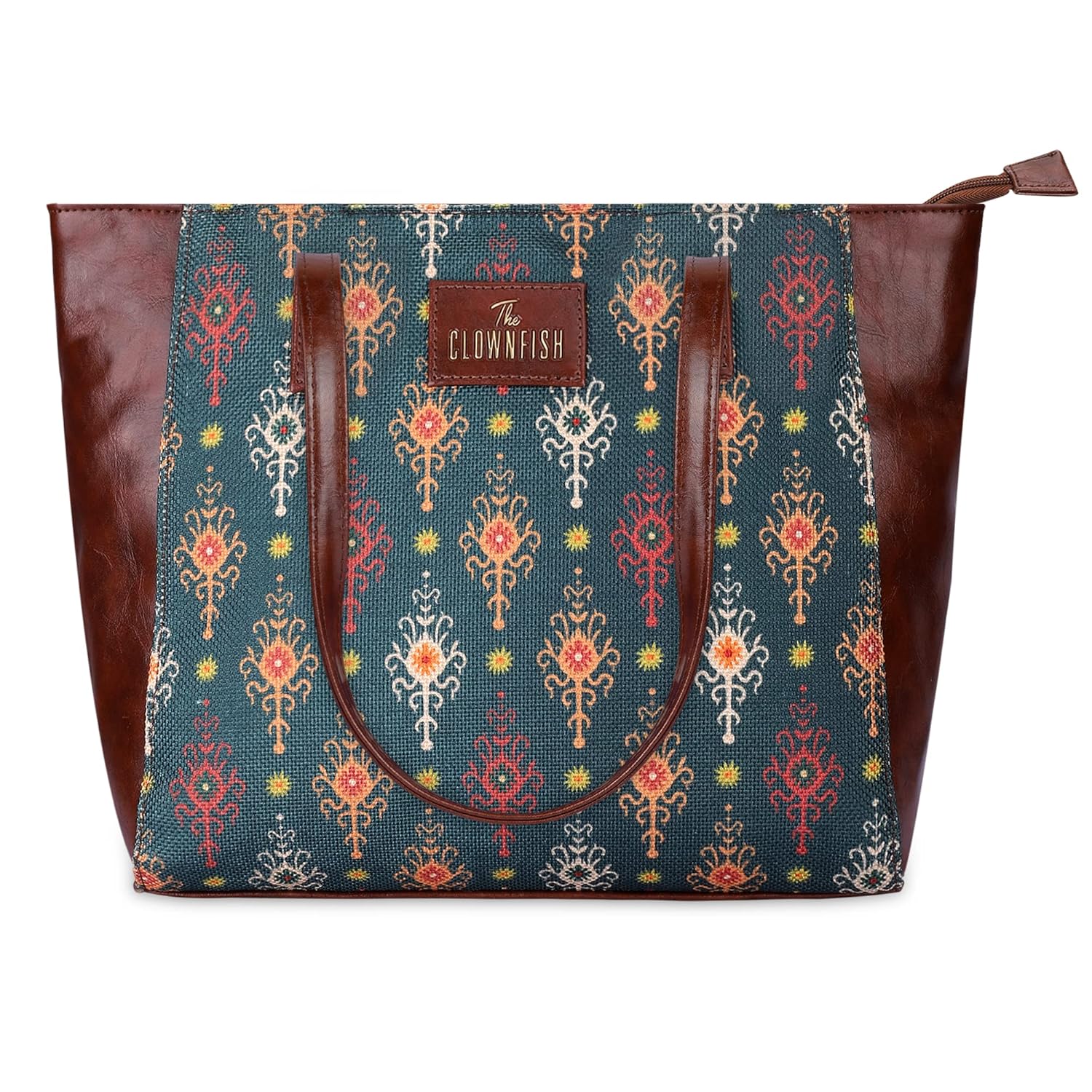 The fabric has a printed jute design, which is a handcrafted material, and the brown part is made of vegan leather.