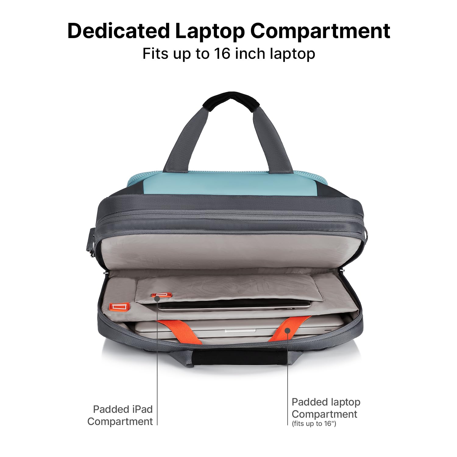 Customers find this laptop bag to be well-made and spacious, suitable for both office and travel use. The bag features multiple compartments that keep items organized, and one customer notes it has separate sleeves for laptops and iPads. They appreciate its durability, stylish appearance, and consider it worth the price.