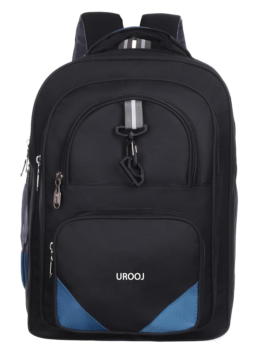 A sporty versatile school laptop collage office backpack from UROOJ made of polyester. It has 4 opening compartments and 2 for quick and easy access to essentials, while the mesh padding on the back panel will feel comfortable even on a hot day. Stylish and durable backpack for office, school/college and travelling. Easily accommodate a laptop. Size: 43 cm X 32 cm X 22 cm