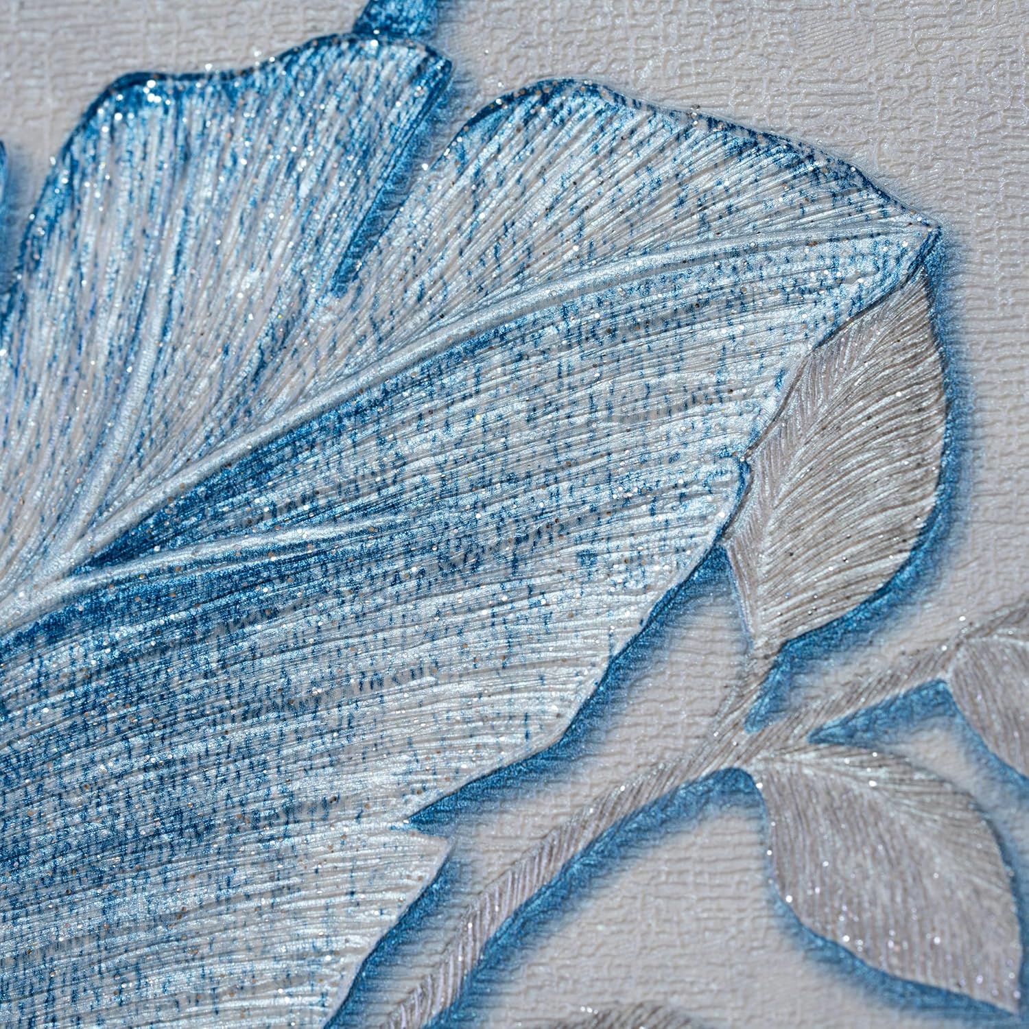 Blue Leaf Design: Wallpaper for the living room shows an elegant blue and silver leaves pattern, adding a touch of sophistication and freshness to your interiors. With a luxurious glow and texture, the wallpaper of the Volpin brings a subtle glow to your interiors, creating a glamorous atmosphere.