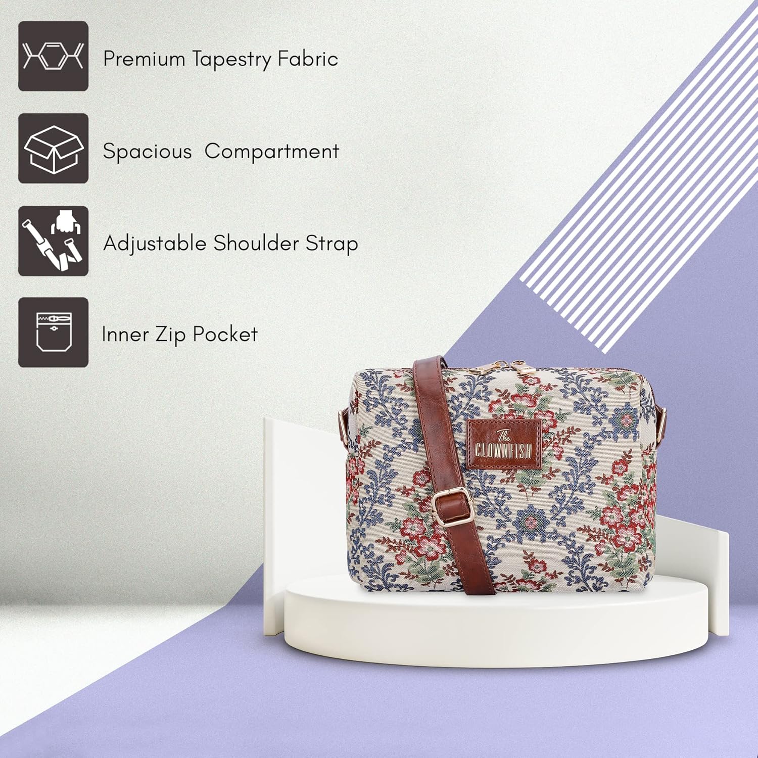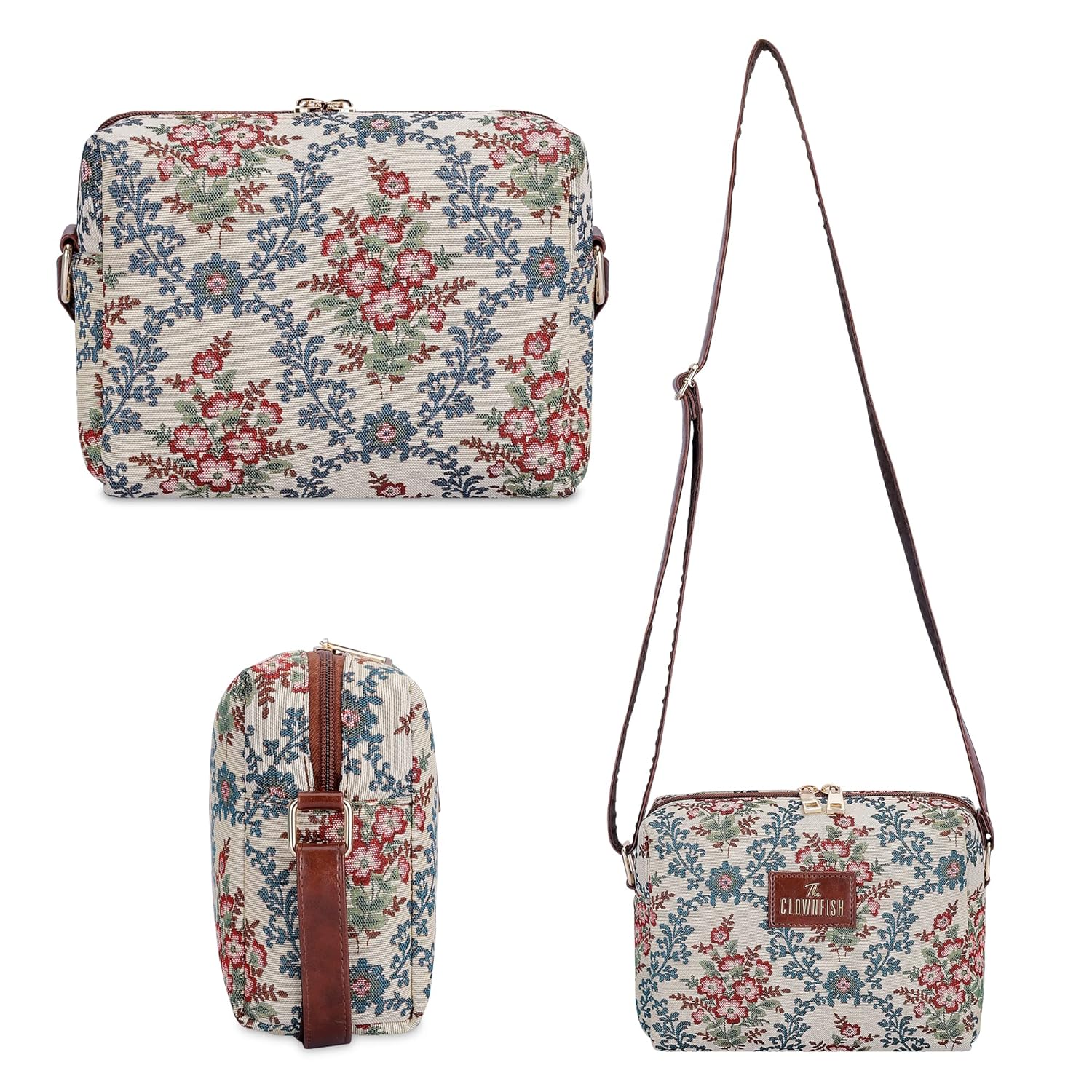 This sling bag is made from a combination of premium faux leather and tapestry material. Premium quality polyester fabric is used for the soft feel of the inner layer.